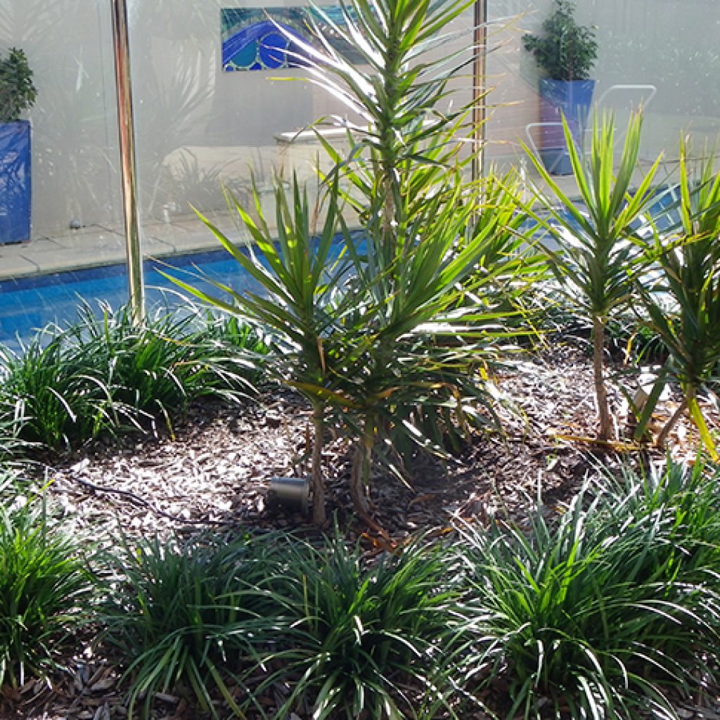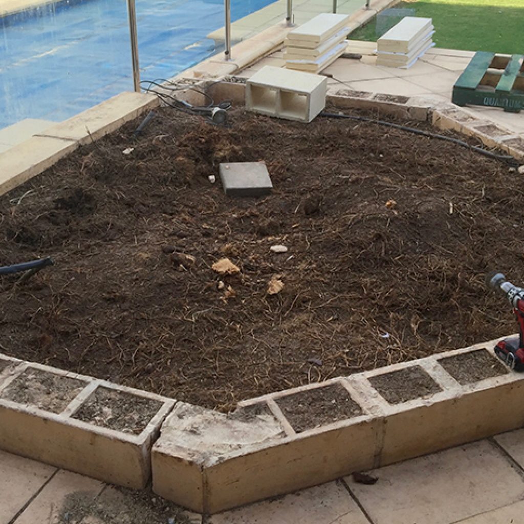 The feature garden bed in this pool courtyard was badly damaged when a large palm tree was removed.